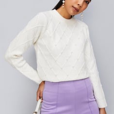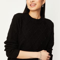 Dress for the season in style with this sweater that is highlighted with pearl embellishments all over. It is designed with a round neckline and full sleeves. Wear this sweater with jeans and boots.