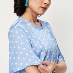 A classic addition to your wardrobe, this top is highlighted with polka dot prints. It is designed with a round neckline, flared sleeves, and a detachable necklace. Pair this top with trousers and pumps to take your style up a notch.