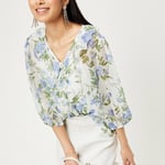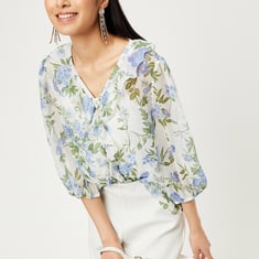 Look effortlessly chic when wearing this casual top. It features a V-neck, ruffled details at the neck, and a button placket on the front, along with three-quarter sleeves and a curved hem. The floral printed pattern offers a fashionable statement. A solid camisole with spaghetti straps provides comfort with style.