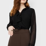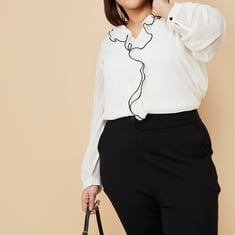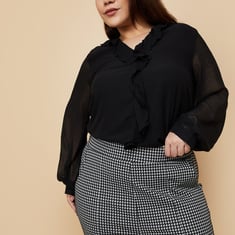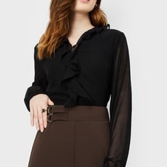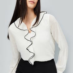 Look effortlessly chic in this casual top, designed to elevate your everyday style. It features charming ruffled details at the neck, full sleeves for added comfort, and a flattering curved hem that adds a touch of elegance.