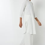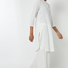 Keep it breezy and stylish with this seersucker straight kurta set, perfect for warm-weather days. The kurta features a band collar neck, button placket, and 3/4th sleeves, paired with airy palazzos featuring an elasticated waist.