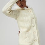Perfect your warm winter styling with this long cardigan. It features a hooded neck, oversized button front closure, long sleeves, and waist pockets. Layer this cardigan over a tee and team it up with trousers, sandals, and a handheld bag.
