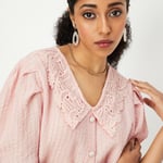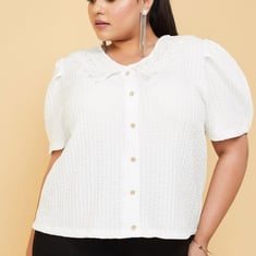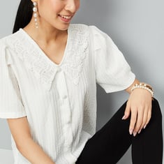 Upgrade your casual wardrobe with this unique top featuring half sleeves, a lace Peter Pan collar, embellished button detailing, and a straight hemline. This versatile top effortlessly transitions from casual to polished, adding a touch of sophistication to any ensemble. Model Size :
