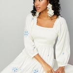 Keep your stylish edge intact with this chic casual dress. It features a square neck, three-fourth-length puffed sleeves, and a smocked top that effortlessly combines fashion and comfort. The all-over embroidered design, along with the regular fit and midi length silhouette, makes it an ideal choice for women who prioritize both design and comfort in their wardrobe.