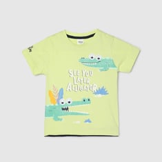 A perfect addition to your kid's summer collection is this T-shirt highlighted with graphic print. It features a crew neck and half sleeves.