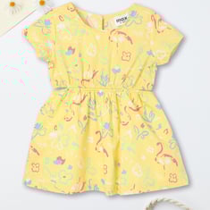 Your kid will have a happier day wearing this delightful printed fit and flare dress. Featuring a charming round neckline, and half-sleeves, it also includes a button and a cut-out detail at the waist for added flair.