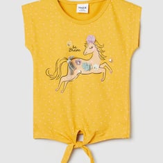 This chic top comes with a printed surface, half-sleeve constructions, tie-up detail, and a round neckline.