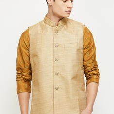 This ethnic waistcoat is designed with a band collar, button-down silhouette, and sleeveless construction. Style it with a kurta and trousers for a stylish yet festive look.