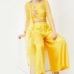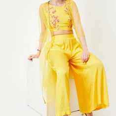 Dress up for occasions in this set. It includes a crop top with contrast embroidery and beaded detailing, a round neck, and a sleeveless construction. The pair of embellished palazzos has a partially elasticated waist. The mesh longline jacket has an open front and three-quarter sleeves.