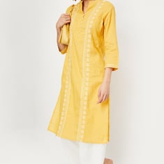 Create an effortless look with this straight kurta. It has three-quarter sleeves, pockets, a band collar with an embroidery design on the front and a button placket. To get an elegant look, wear this kurta with a pair of leggings and sandals.
