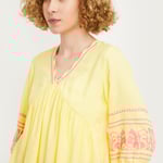 Achieve the perfect casual chic style with this tunic, adorned with puff sleeves and a flattering V-neckline that accentuates the empire waist. The elegant embroidery and classic sleeves add a timeless touch to the ensemble.