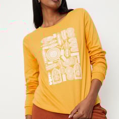 A wardrobe staple, this T-shirt is highlighted with a graphic print at the front. It is styled with a round neckline and long sleeves. Team up this tee with trousers and flats for an elevated look.