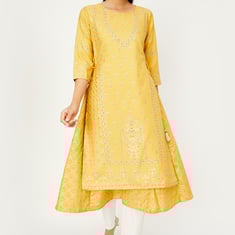Dress up for occasions in this printed layered kurta. It has a printed inner layer in an A-line profile. It features a round neckline, three-quarter sleeves, tie-up detail and calf-length construction. Pair this kurta with palazzos and block heels for an elevated style.