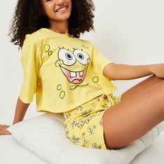This fun SpongeBob print shorts set includes a playful crop t-shirt with a crew neck, drop shoulder sleeves, and a matching pair of printed shorts. The shorts feature a drawstring closure and side pockets for added comfort and functionality.