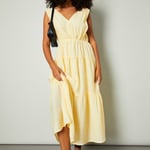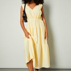 This textured tiered maxi dress exudes effortless elegance and flowy charm. Featuring a flattering V-neck and sleeveless design, it offers a breezy silhouette perfect for warm days and relaxed occasions.