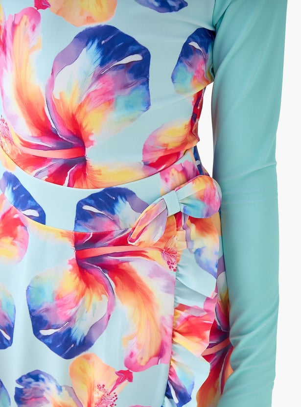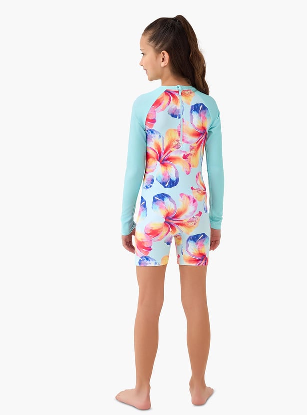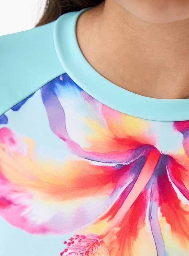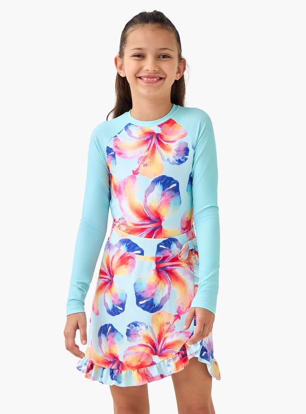 This vibrant floral print swimwear offers style and protection for water adventures. The raglan-sleeve rashguard with a mock neck provides excellent sun protection. Complementing the swimsuit is the coordinating swim skirt that features a playful ruffle trim. The quick-drying fabric provides practical functionality for swimming and beach activities.