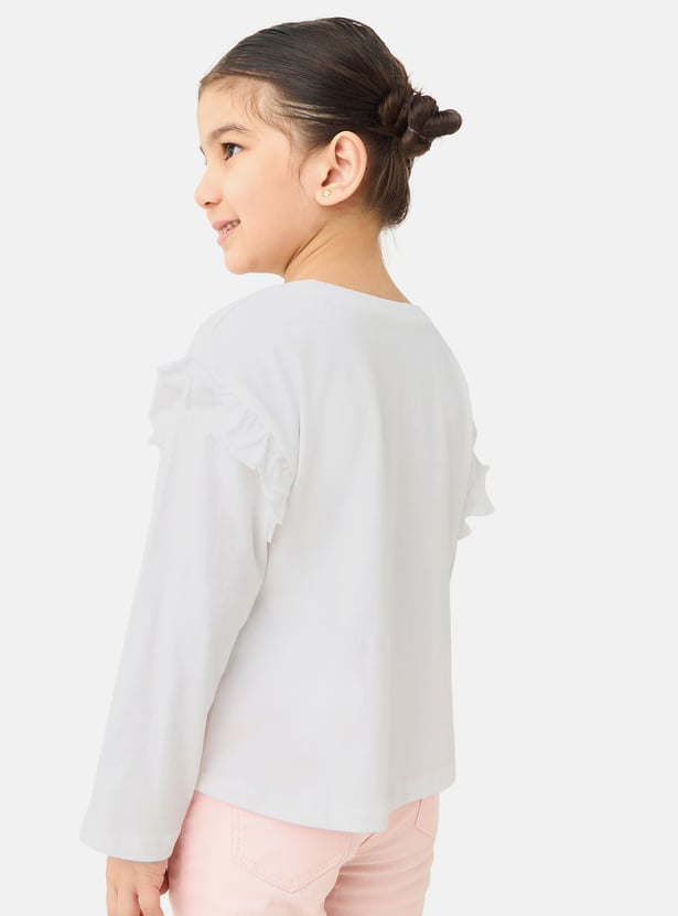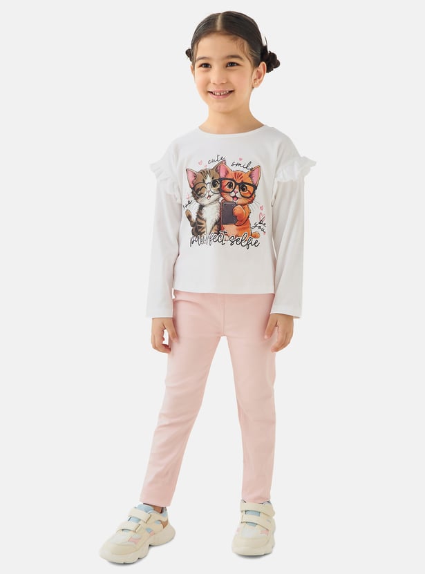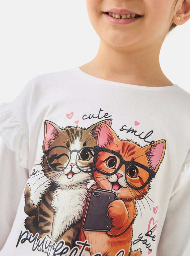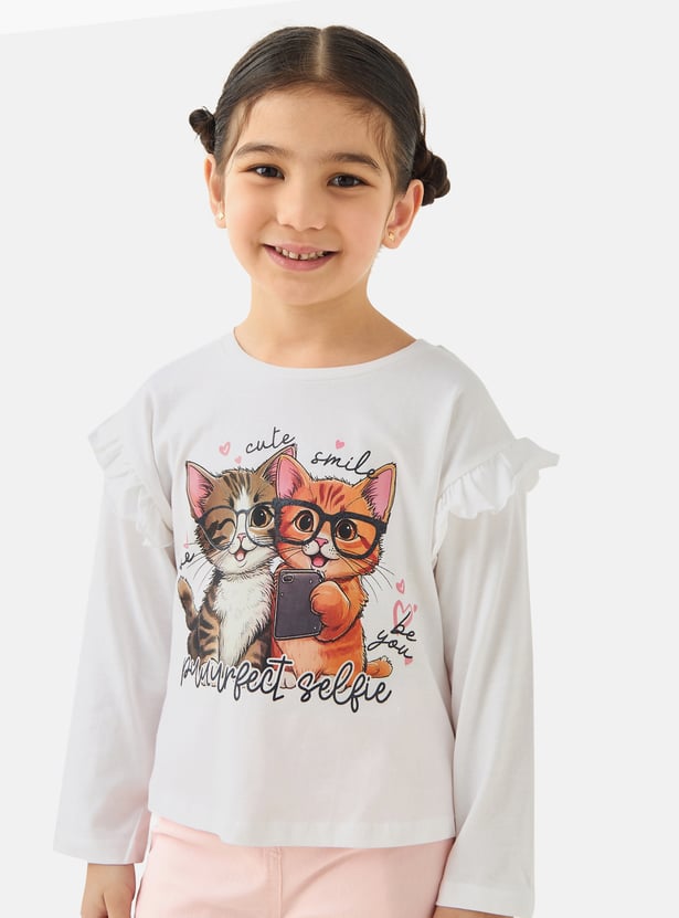 Introduce a touch of playful charm to her wardrobe with this delightful graphic t-shirt, featuring an adorable cat selfie print that is sure to make her smile. This comfortable long-sleeved top for girls is crafted from soft, breathable fabric with a classic round neck, making it ideal for everyday adventures and playdates. The charming ruffle detailing on the shoulders adds a sweet, fashionable flourish to the design.