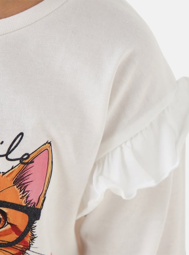 Juniors Cat Print T-shirt with Long Sleeves