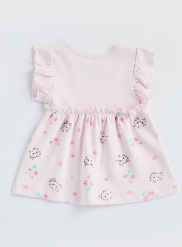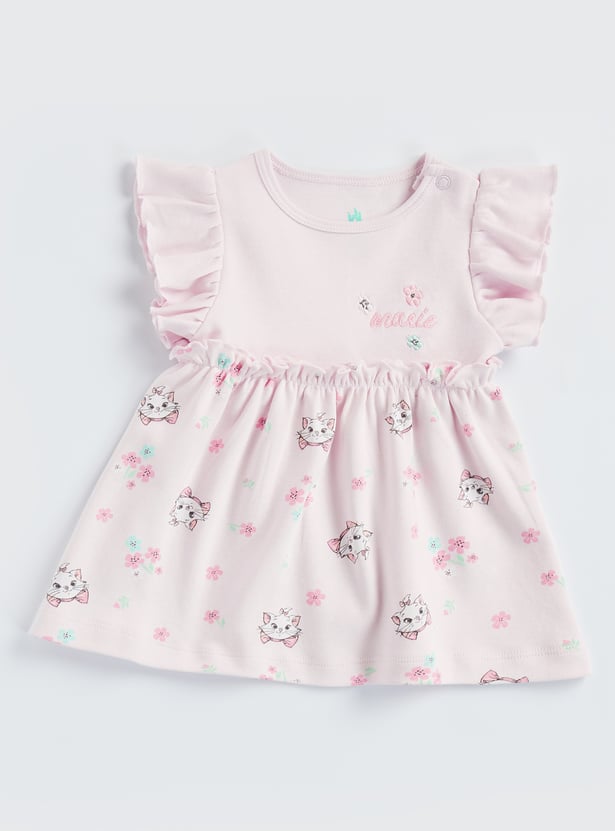 Whispering sweetness with every little twirl, this Marie print dress is perfect for charming days out. Designed with a soft, round neckline, delicate ruffled sleeves, and a gently gathered waist for a flowy silhouette, it feels as lovely as it looks. The fine embroidery and playful character detailing add a storybook touch, while the button closure ensures easy dressing and all-day comfort. Crafted from soft, breathable fabric that’s gentle on delicate skin and ideal for everyday wear.