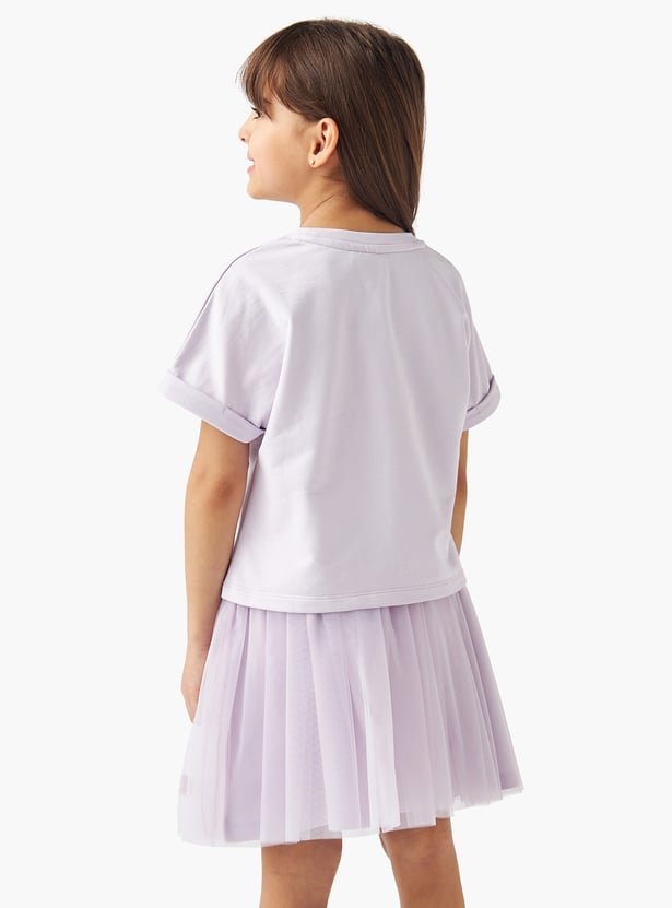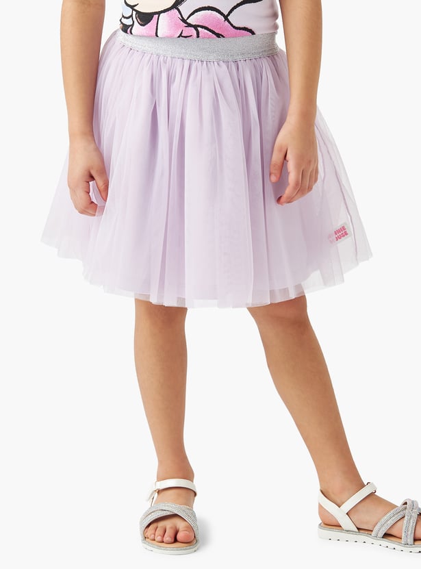 This charming two-piece set features a Minnie Mouse t-shirt and a skirt, ideal for playtime or parties. The t-shirt showcases a delightful Minnie Mouse graphic print with stone embellishments, adding a touch of Disney magic to her wardrobe. The soft tulle skirt provides a playful, twirling silhouette. This versatile set offers both comfort and style, making it a perfect choice for any young Disney fan.