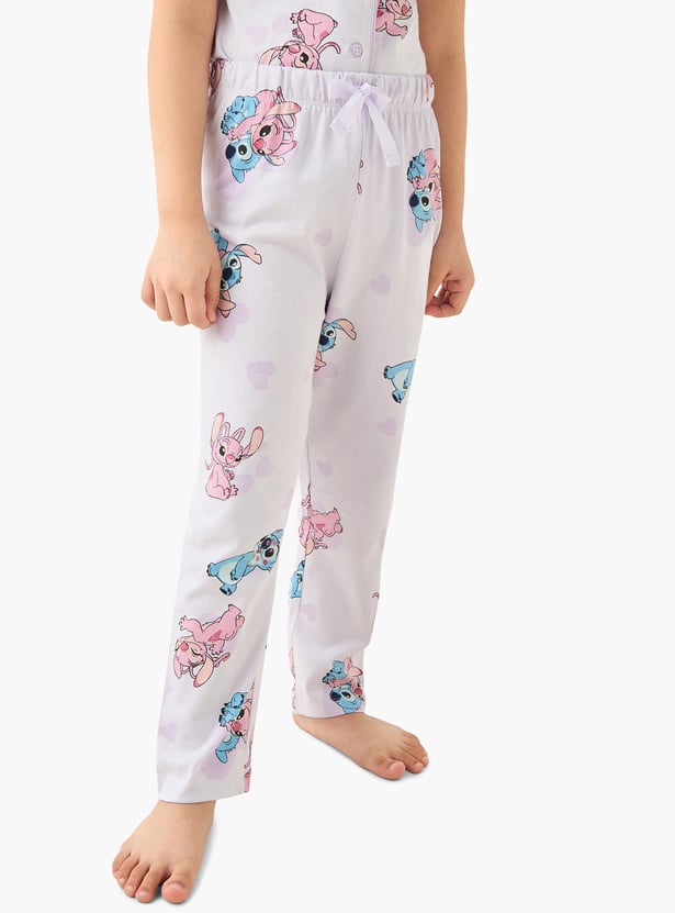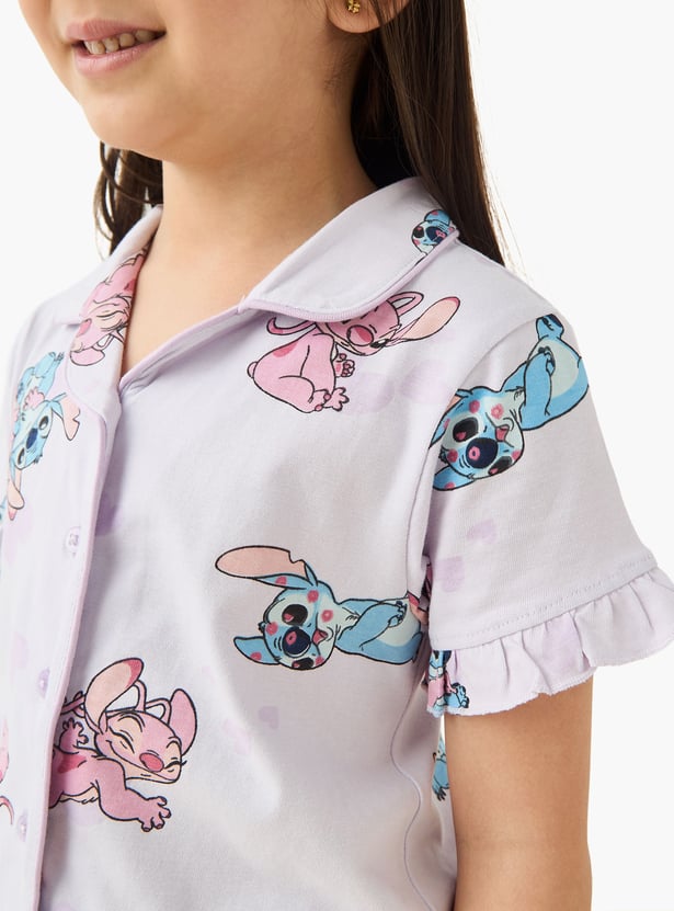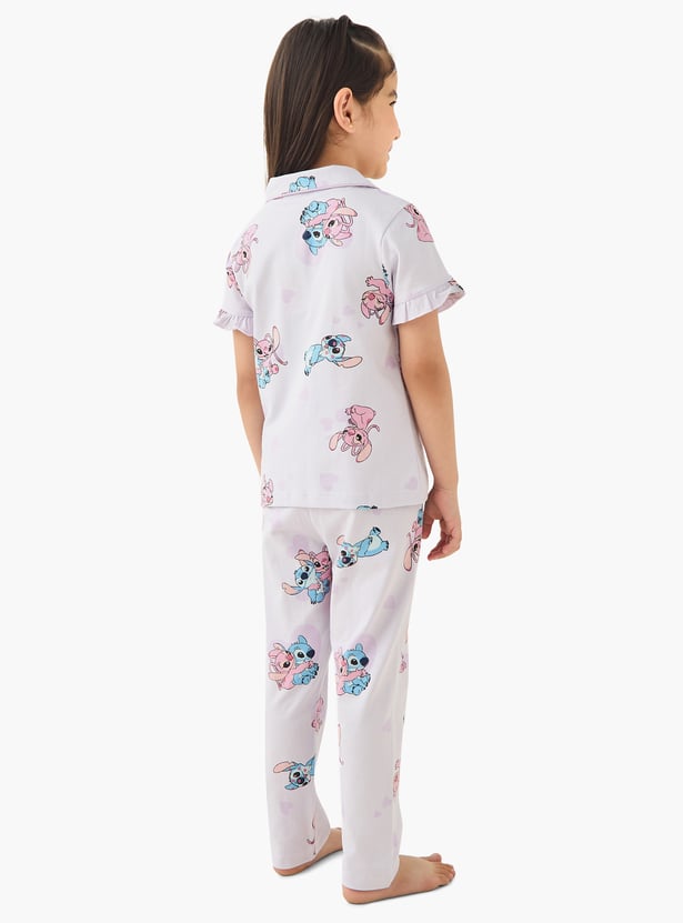 Ensure delightful dreams with this charming Stitch and Angel print pyjama set, designed for ultimate comfort and style. This two-piece short sleeve sleepwear set features a classic button-up shirt with sweet ruffle details and matching full-length pyjamas. The pyjamas are equipped with a gentle drawstring waistband, which provides a secure and adjustable fit throughout the night. Crafted from a soft fabric, these character print pyjamas are a wonderful choice for any young Disney fan, making bedtime something to look forward to.