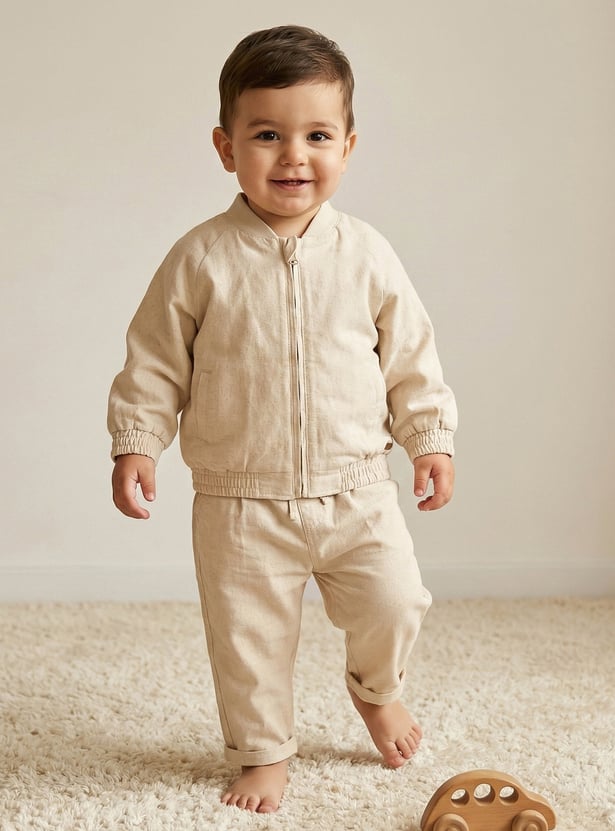 Elevate his everyday style with this smart two-piece set, designed to offer both comfort and contemporary charm for young boys. The textured bomber jacket features a full-zip closure for easy layering and ribbed cuffs for a snug, polished finish. Paired with coordinating trousers, designed with an elasticated waistband and adjustable drawstring, this set ensures a comfortable and flexible fit. Versatile and effortlessly stylish, it’s an excellent choice for casual outings, family gatherings, or special occasions.
