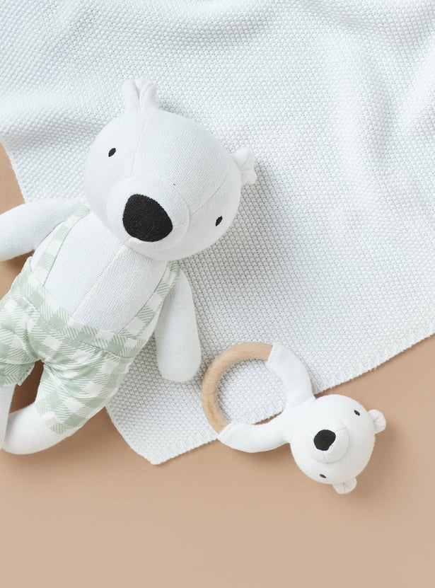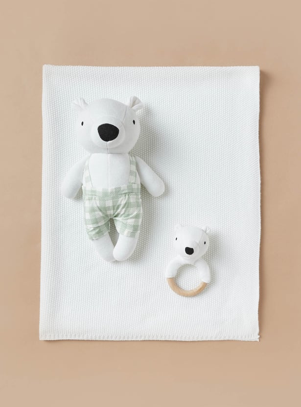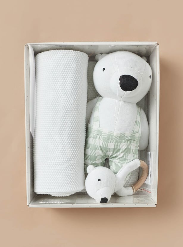 This delightful knitted gift set is perfect for new parents. The set includes a blanket, toy, and rattle, all made from soft fabric. The blanket is perfect for swaddling your little one, while the toy and rattle will keep them entertained. This set is also a sweet gift for baby showers or birthdays.