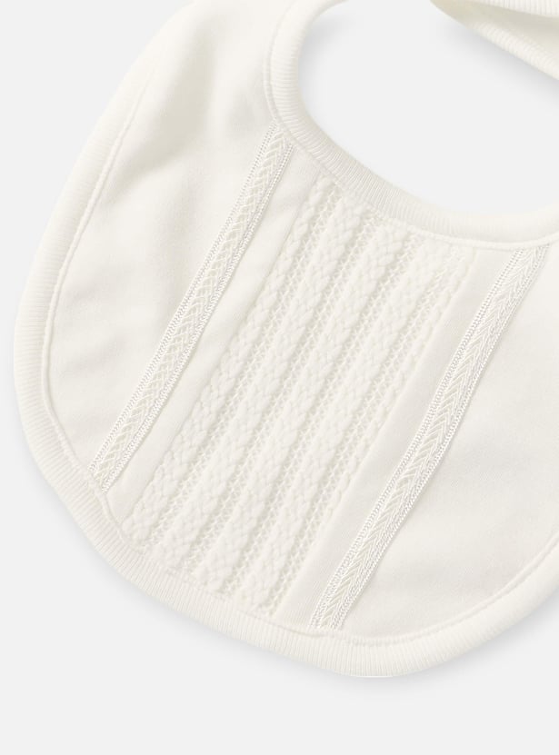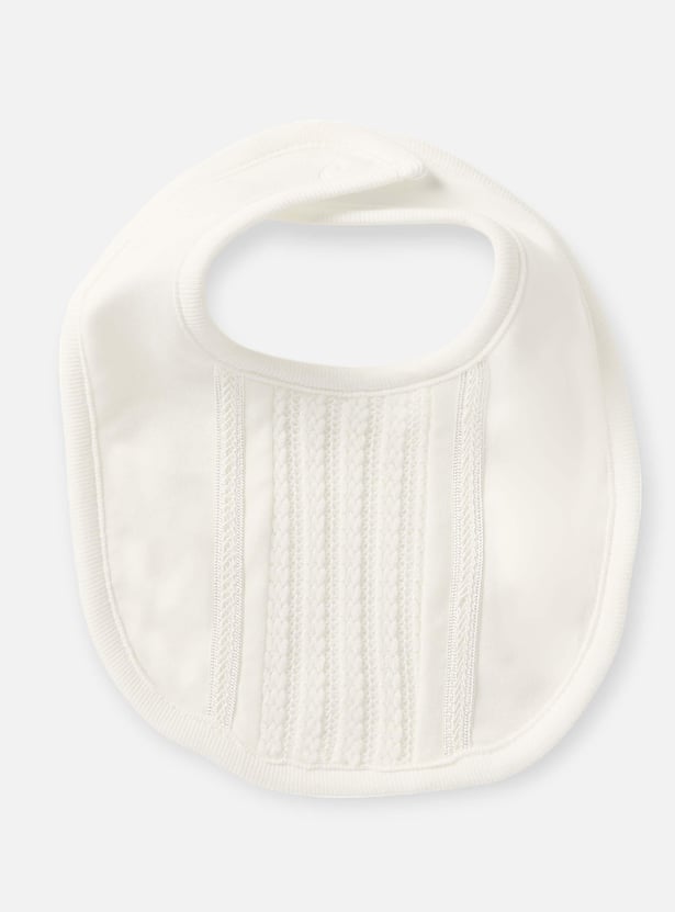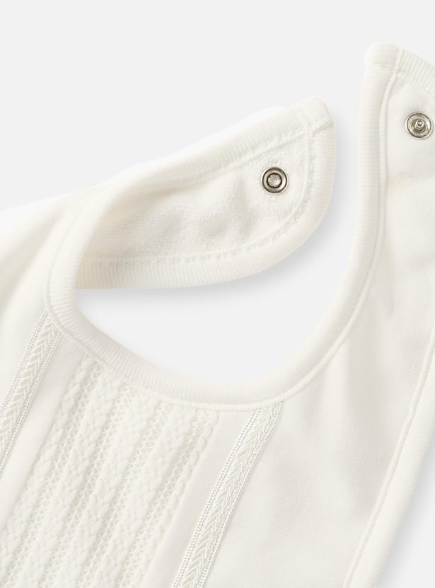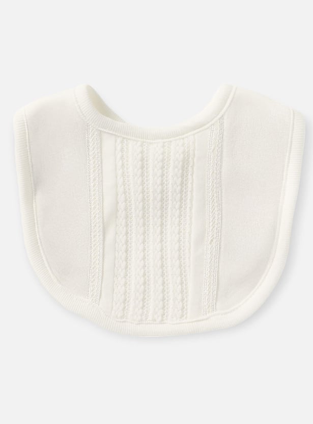 Keep your baby's clothes free from food stains and dribble with this charming textured bib. Made from soft, gentle material, it features a convenient button closure for easy wearing. The bib's subtle textured pattern and cool colour add to its overall appeal, making it a practical and stylish choice for mealtime.
