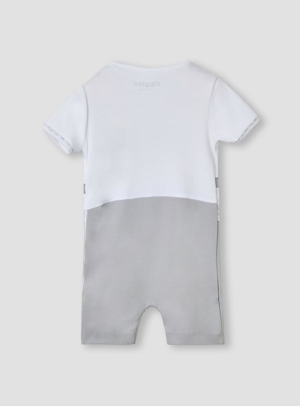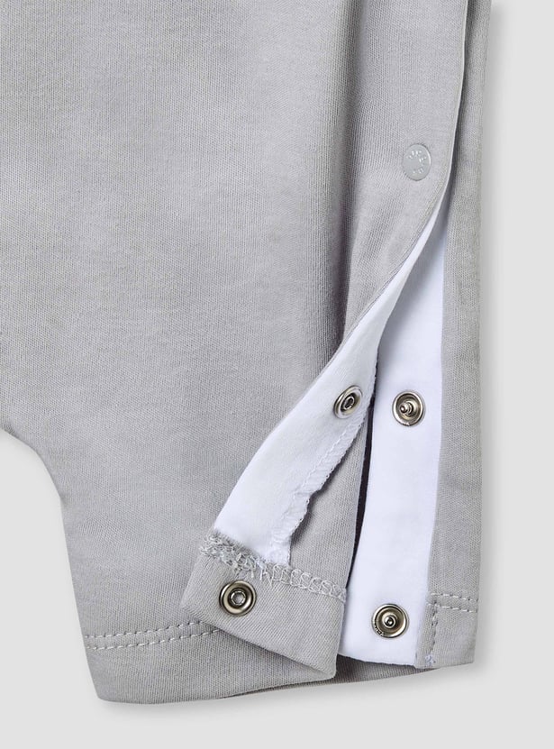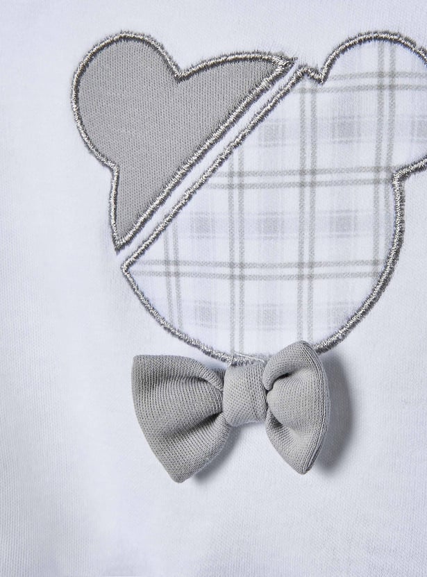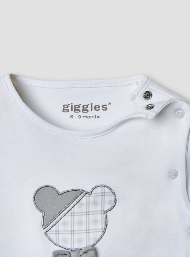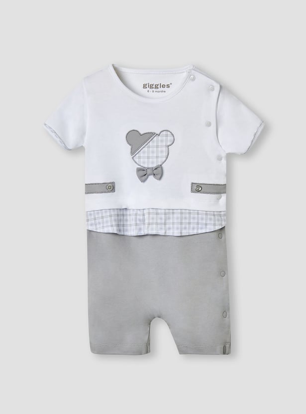 This charming baby romper features a delightful bear appliqué and a smart checked panel. Practical snap button fastenings allow for easy changing. The soft fabric ensures comfort for your little one.