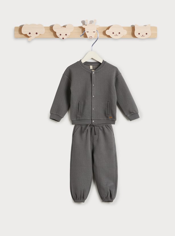 Redefine casual comfort with this knit sweatshirt and joggers set. The sweatshirt features a baseball collar, button closure, and full sleeves—bringing a refined twist to everyday wear. Paired with joggers designed with a drawstring closure and functional pockets, this set blends laid-back ease with practical style