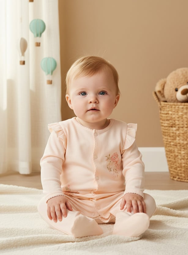 This charming floral print sleepsuit, crafted from soft Supima cotton, ensures a comfortable night's sleep for your little one. The full-length sleeves and footed design offer warmth and cosiness. Delicate ruffles on the shoulders and a practical front button closure add to its appeal. This sleepsuit is a perfect blend of style and comfort for your baby.