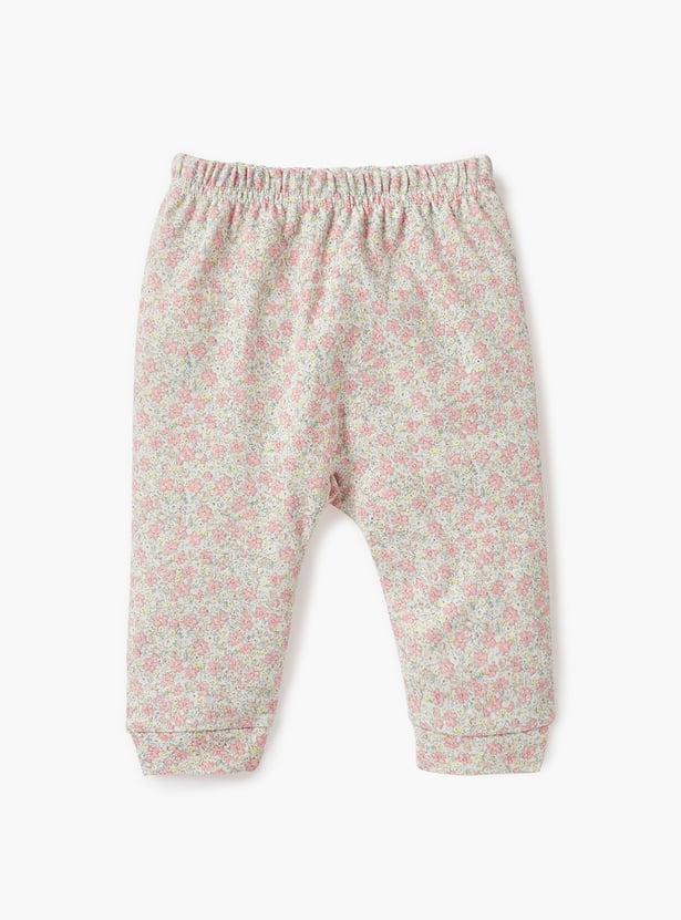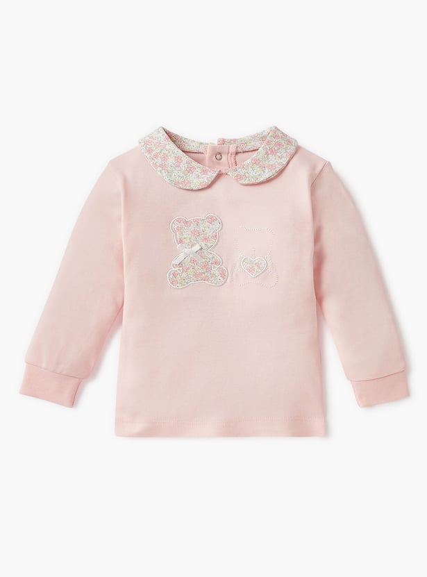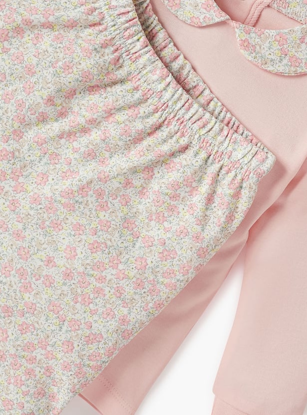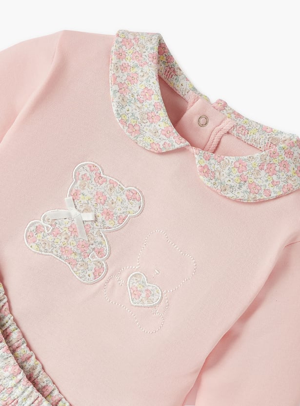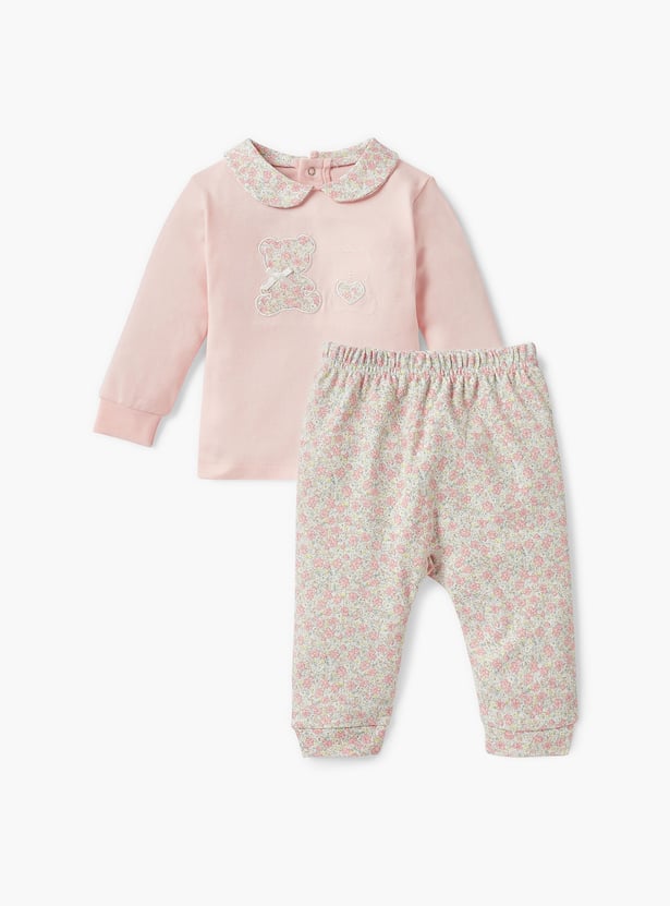 This set features delicate applique detailing and a classic collared neck on the long-sleeve t-shirt, offering a refined touch. The floral print pyjama, designed with an elasticated waistband, ensures a secure and comfortable fit. Crafted from soft, breathable fabric, this set is gentle on delicate skin. A charming and cosy ensemble ideal for restful nights.