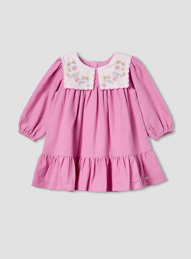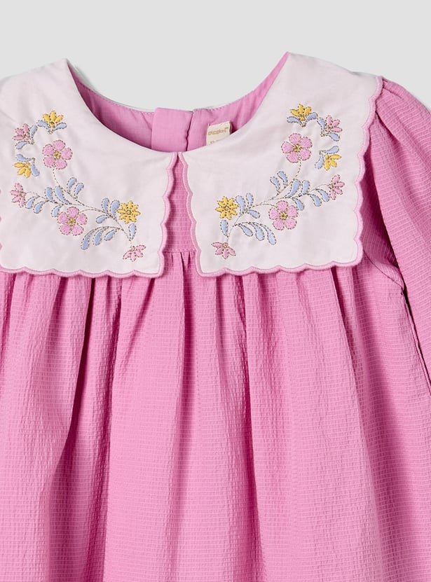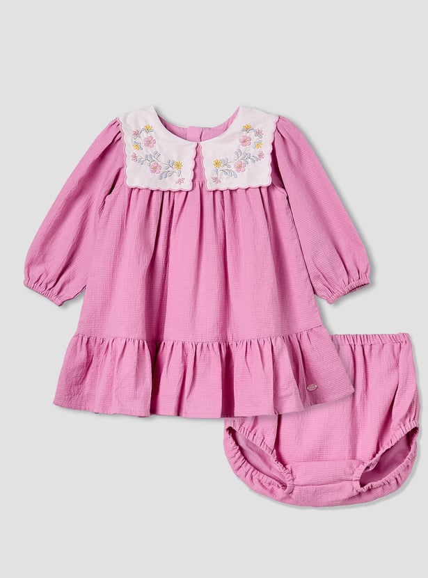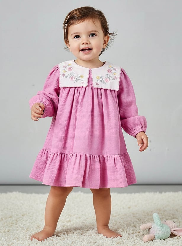 Wrap your little one in sweetness with this charming floral embroidered collar dress set, designed to make every moment feel extra special. The dress features delicate embroidery on a statement collar, long sleeves with gentle gathers, and a flared hem for a graceful touch. Paired with matching bloomers for added comfort and coverage, this adorable ensemble is perfect for celebrations or everyday cuteness. Crafted from soft, breathable fabric, it keeps your baby cosy all day long.