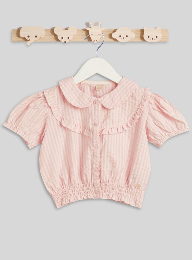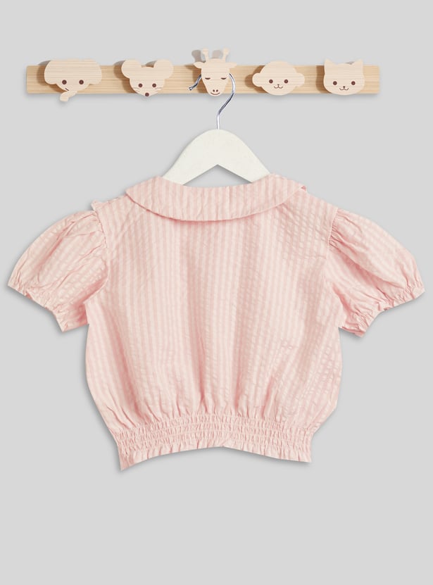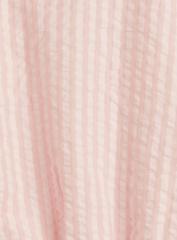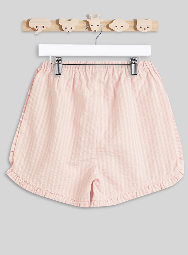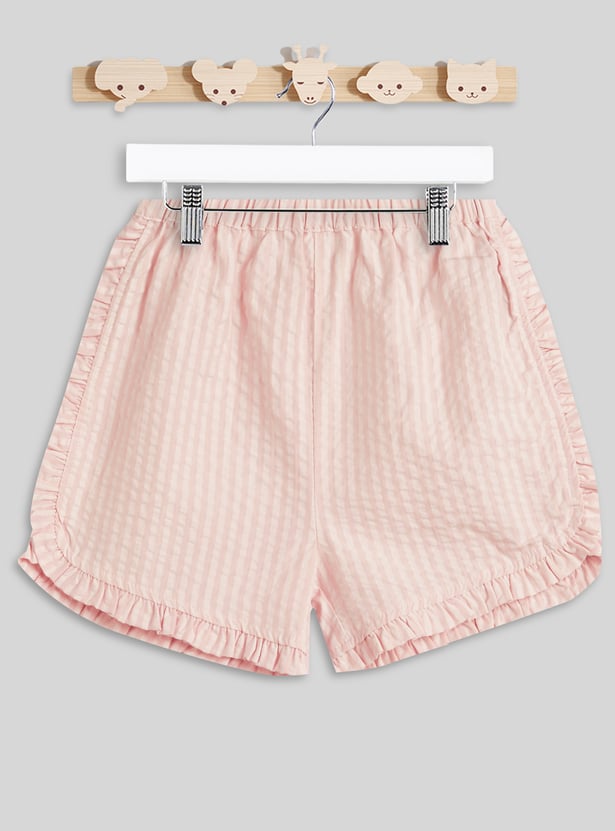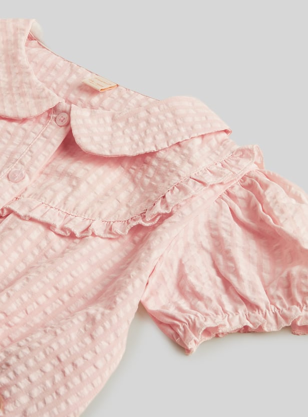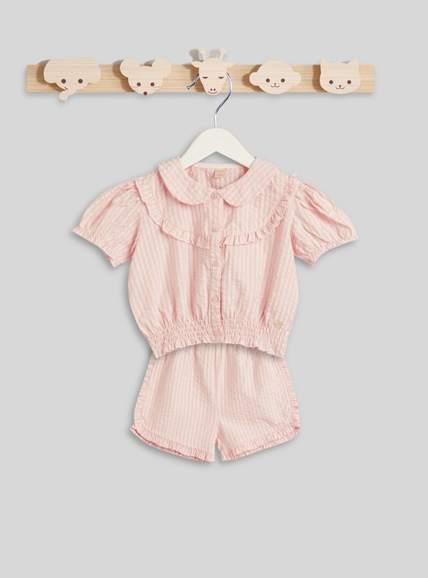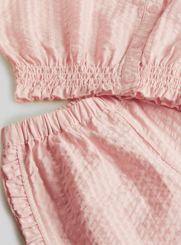 Elevate her wardrobe with this charming seersucker top and shorts set, featuring a classic Peter Pan collar and airy half sleeves. The matching shorts are designed with an elasticated waist for a secure, flexible fit, all crafted from a cloud-soft, textured fabric that ensures all-day comfort for every adventure.
