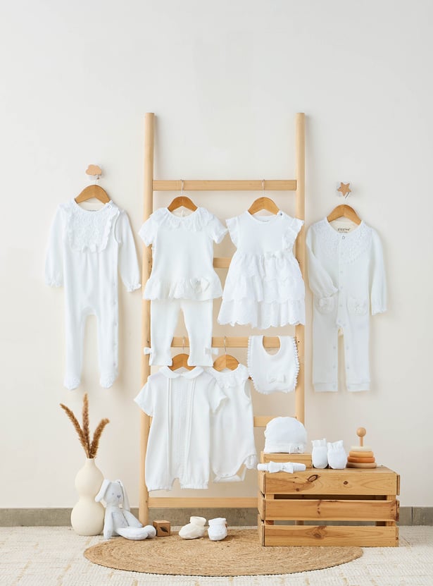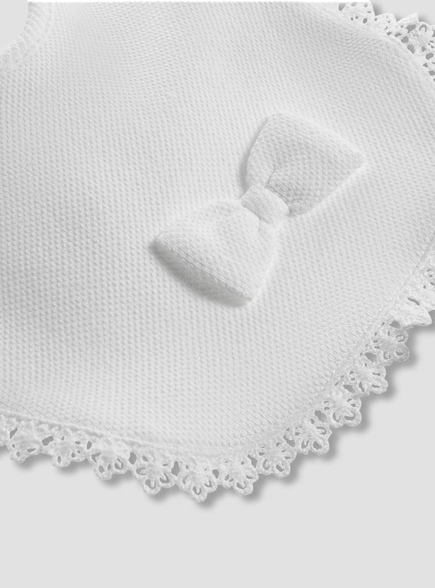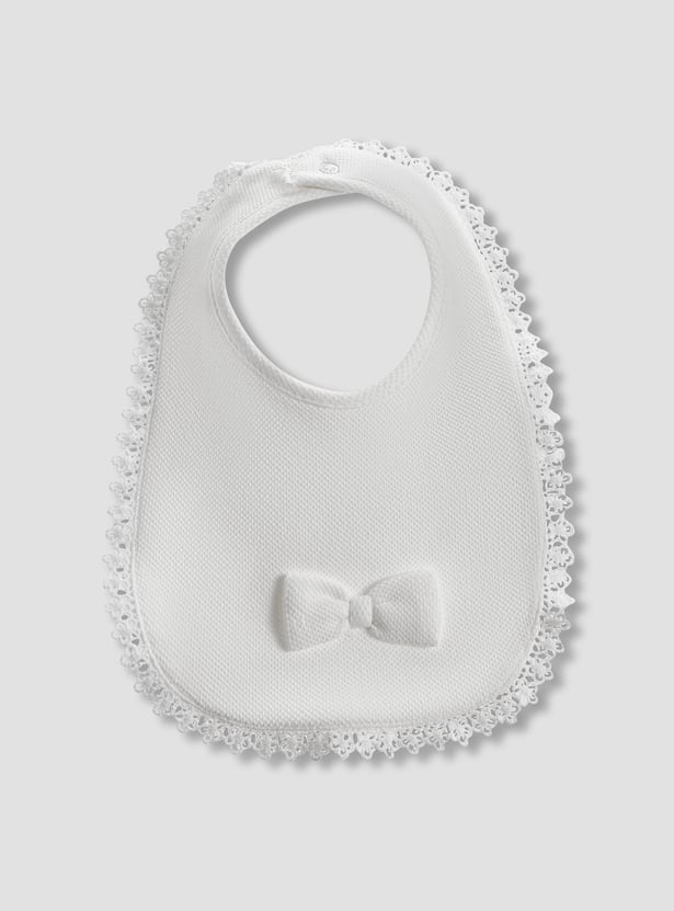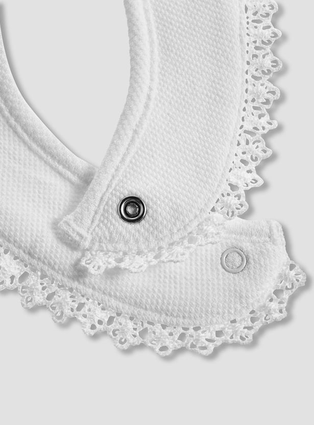Elegant and practical, this bib features delicate lace trim for a charming touch. It is crafted from soft, absorbent fabric to keep your little one clean and comfortable. The secure button closure ensures a snug fit and easy on-off convenience.