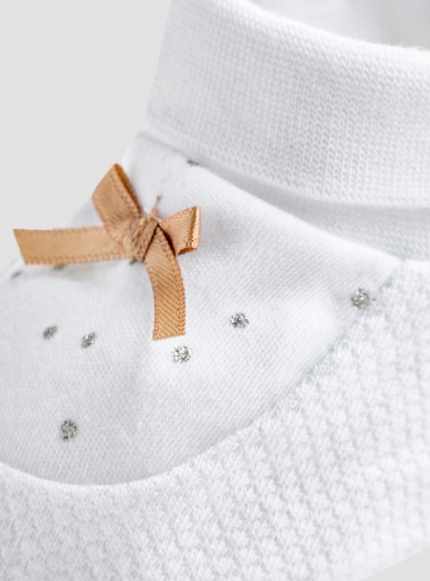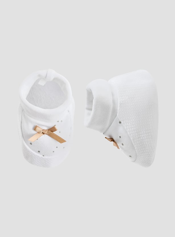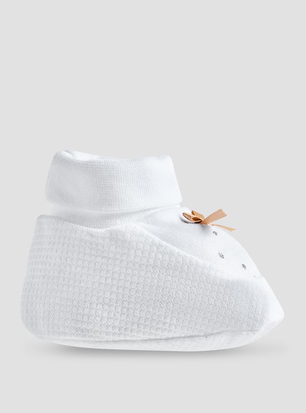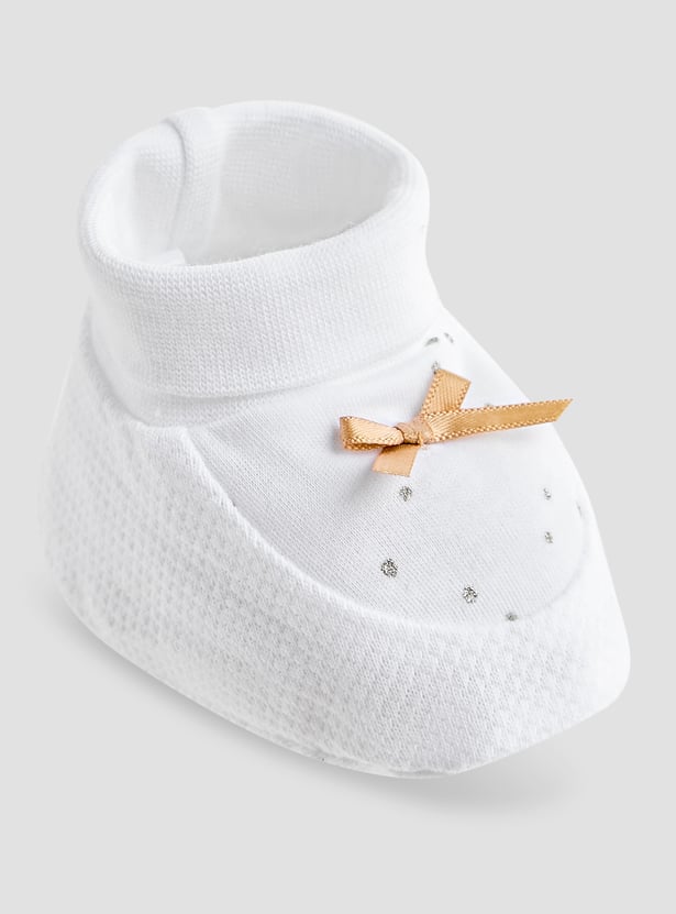 Delicate and charming, these glitter print booties with a bow are perfect for adding a touch of elegance to your baby's look. Crafted from soft fabric, they provide warmth and comfort for tiny feet. The dainty bow detail adds a sweet finishing touch, making them ideal for special occasions or dressy days out.