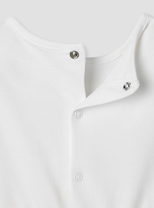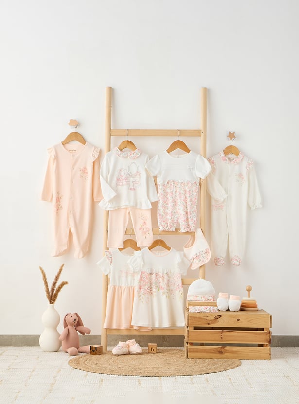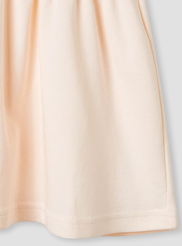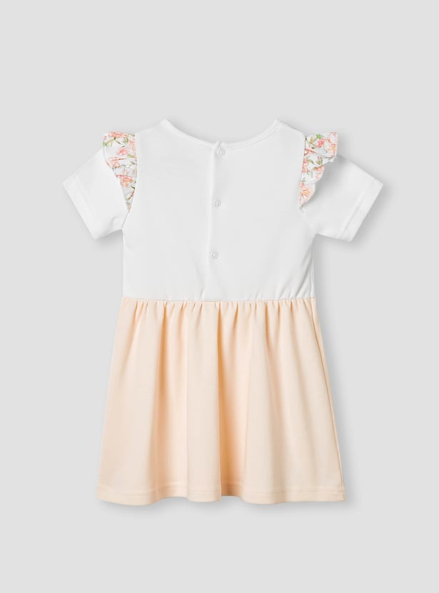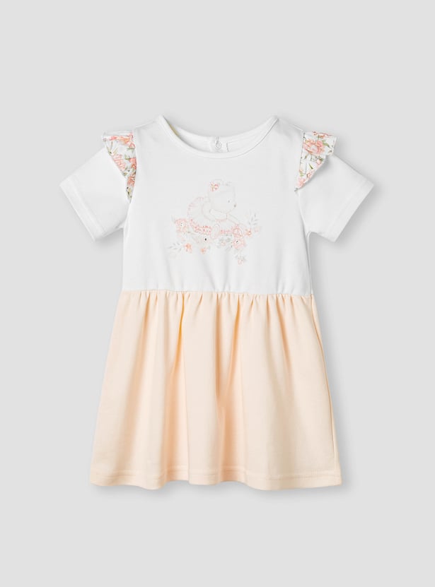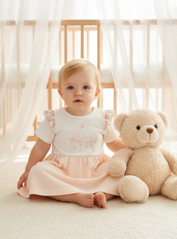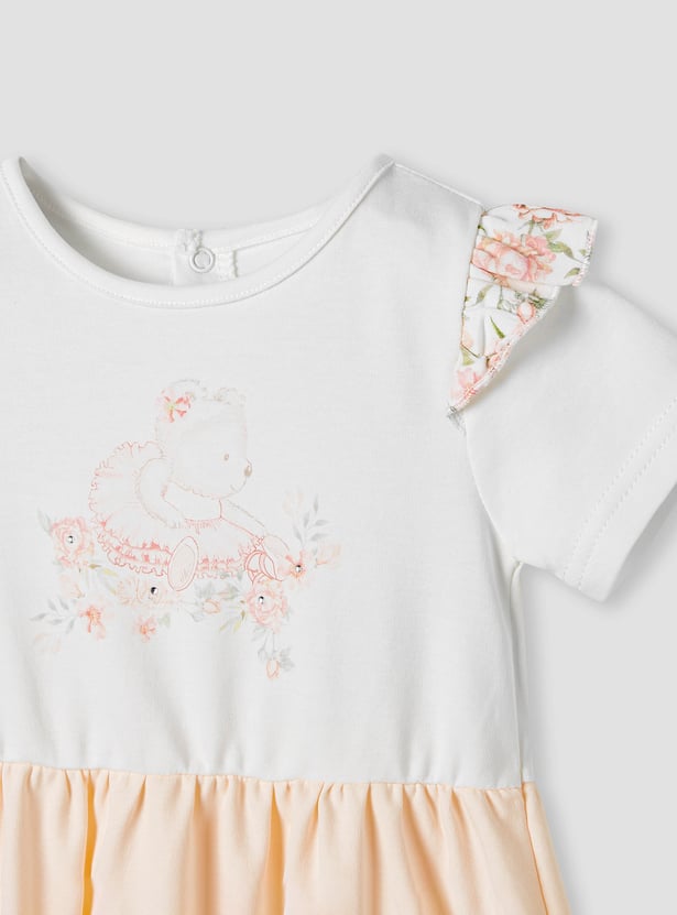 This charming dress features a delightful floral print and a sweet bear graphic. The soft, comfortable fabric and practical button closure at the back ensure ease of dressing. This ruffle detail dress is perfect for special occasions or everyday wear, making it a versatile addition to your little one's wardrobe.