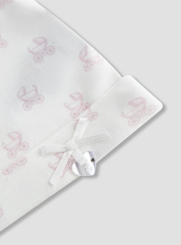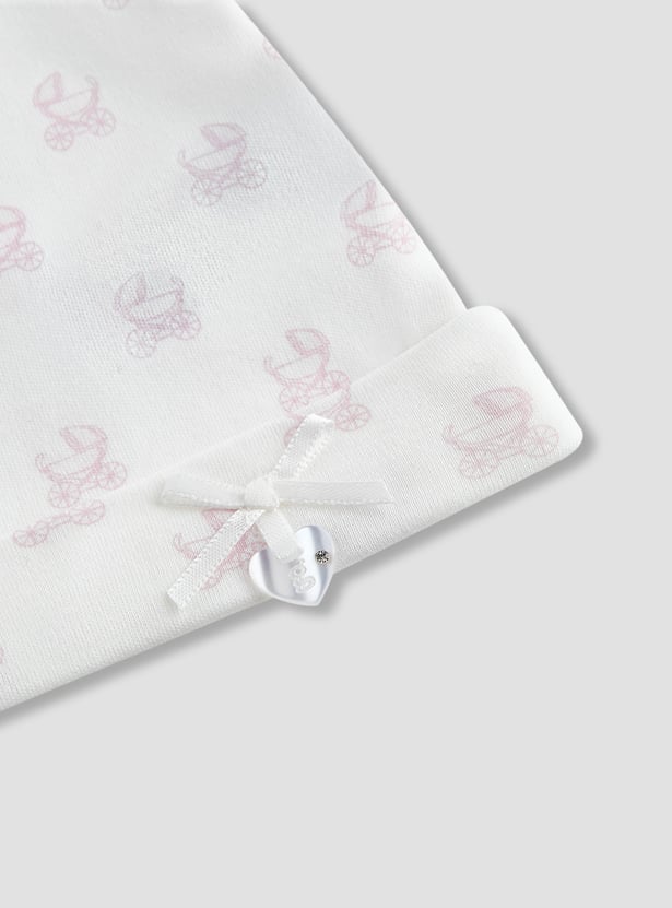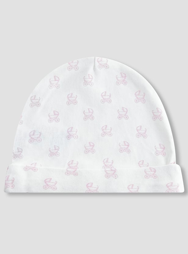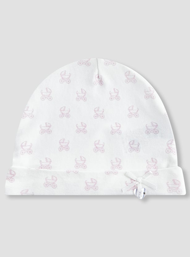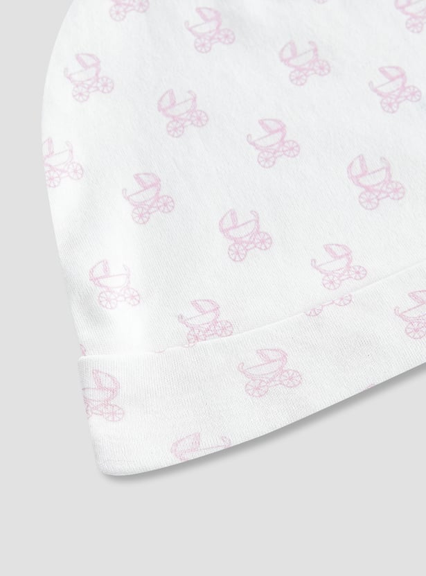 Keep your baby snug and stylish with this adorable printed beanie. Made from soft, stretchable fabric, it offers a gentle and secure fit for delicate heads. Lightweight construction ensures comfort in every season. The sweet prints add a dash of personality to any outfit. Ideal for daily wear or as a thoughtful gift for new parents.