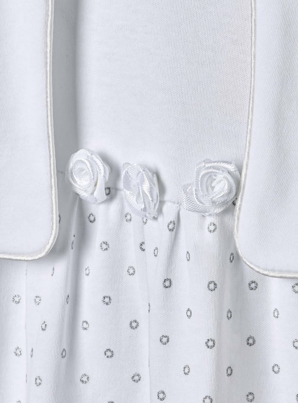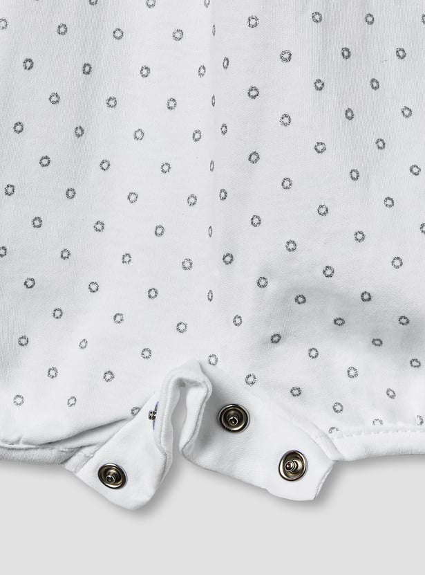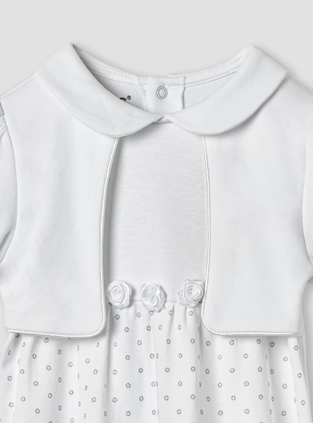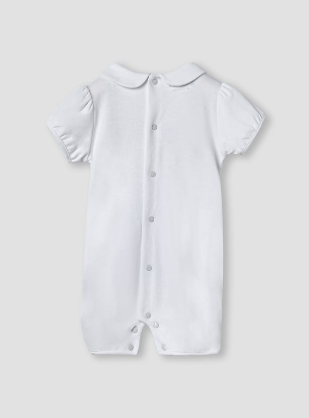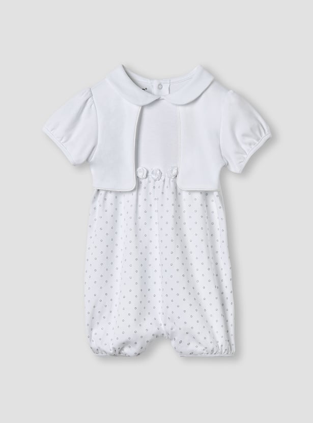 This charming baby romper features a classic Peter Pan collar and a delicate print, perfect for special occasions or everyday wear. The soft, comfortable material and convenient button closure ensure easy dressing. This romper provides a stylish and practical outfit for your little one.