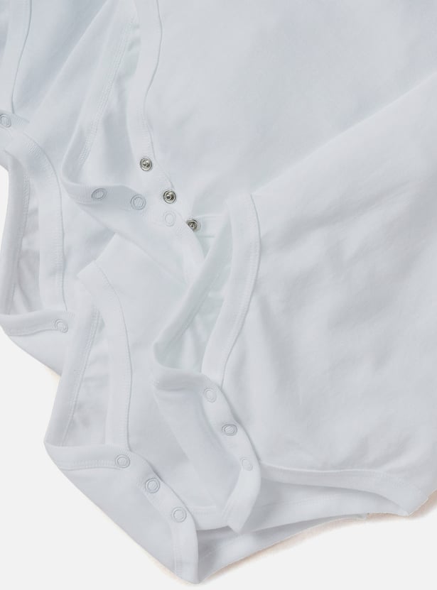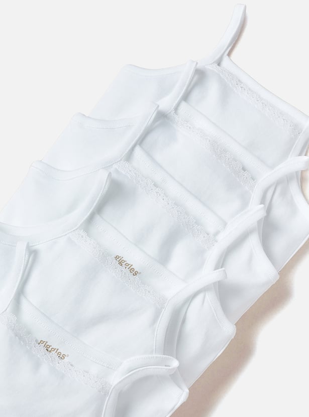 Crisp in colour, this five-piece bodysuit set by Giggles is a value purchase for your baby's collection. Tailor-made from cotton material, these pieces lend a gentle feel against the skin and offer optimum cosiness. The shoulder straps and snap button closure at bottom are the main features. Furthermore, this set is suitable for a machine wash.