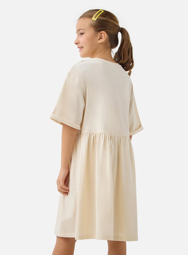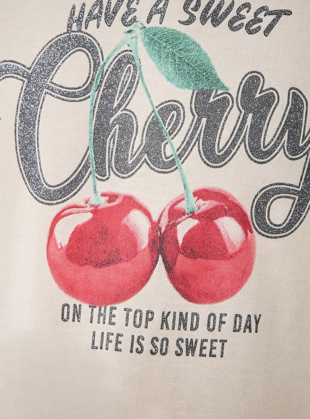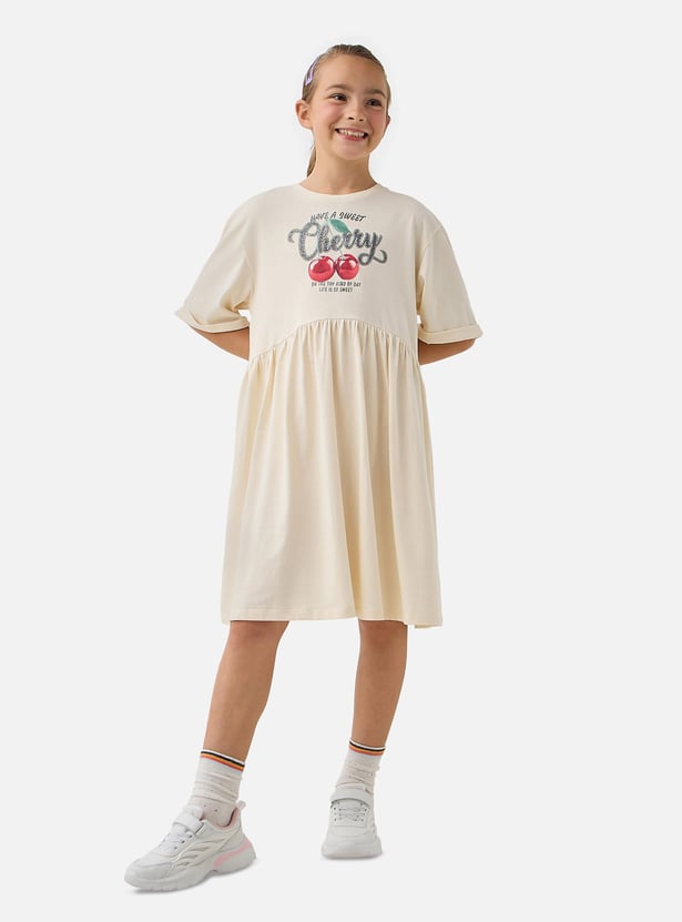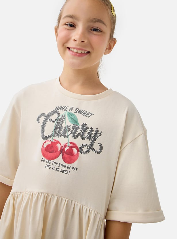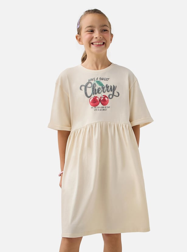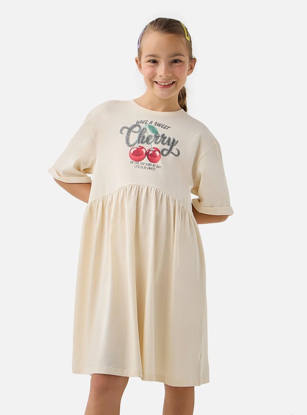 Juniors Cherry Print A-line Dress with Round Neck and Short Sleeves