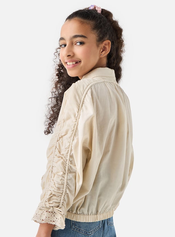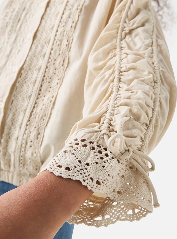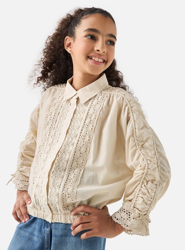 Juniors Crochet Detail Collared Shirt with Long Sleeves