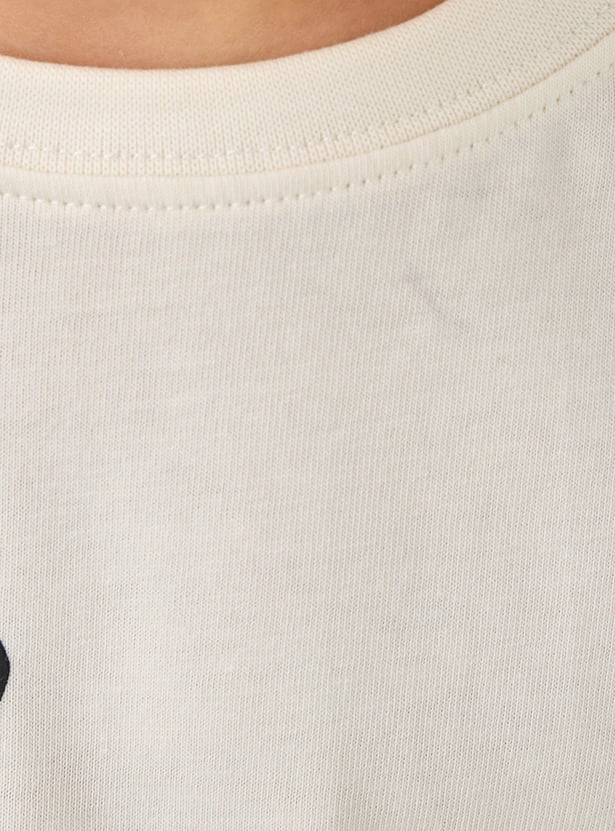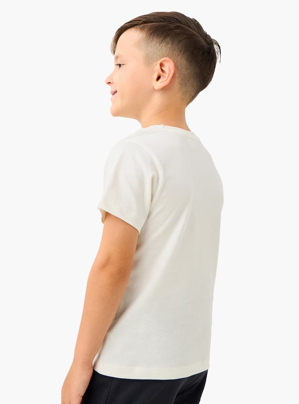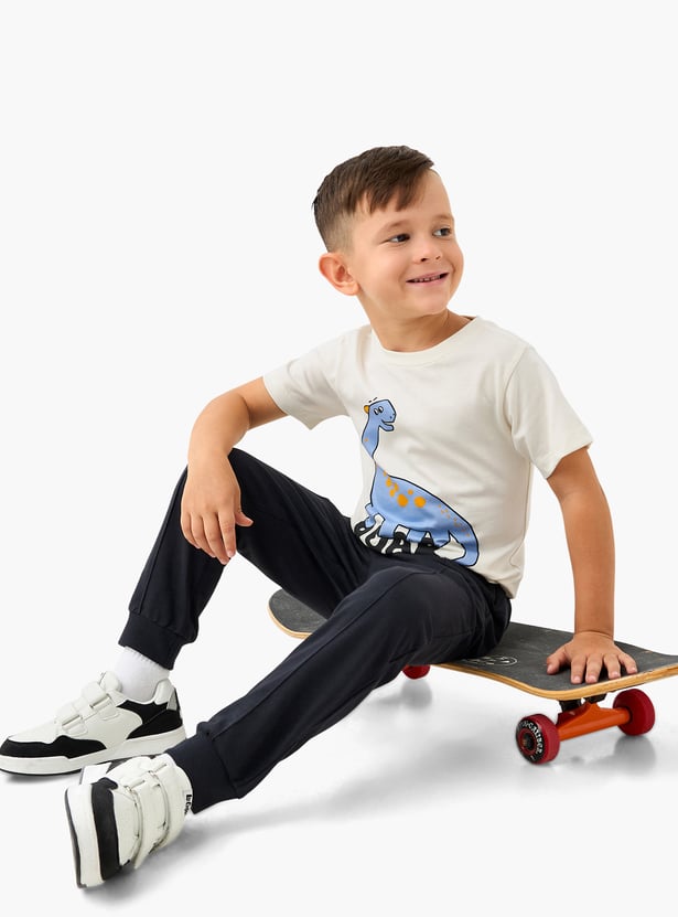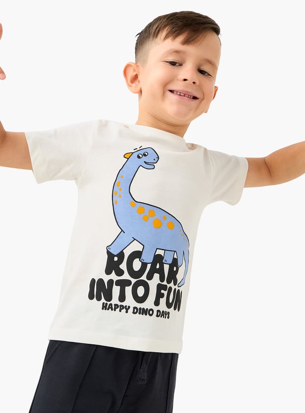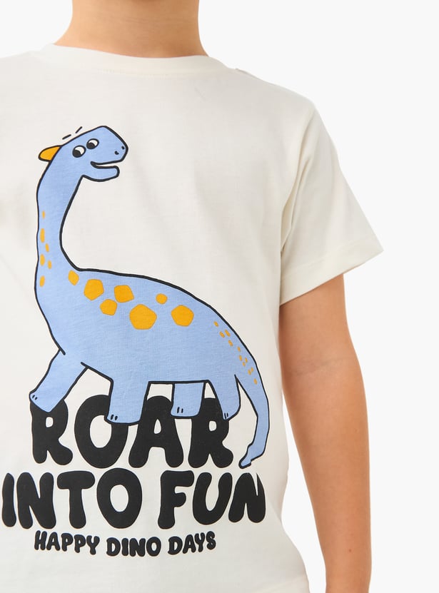 This dino print t-shirt for boys is perfect for young dinosaur enthusiasts. Made from soft, breathable fabric, it ensures comfort throughout the day. Featuring short sleeves and a classic crew neck, this t-shirt combines fun design with practicality for everyday wear.