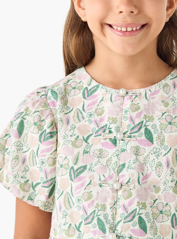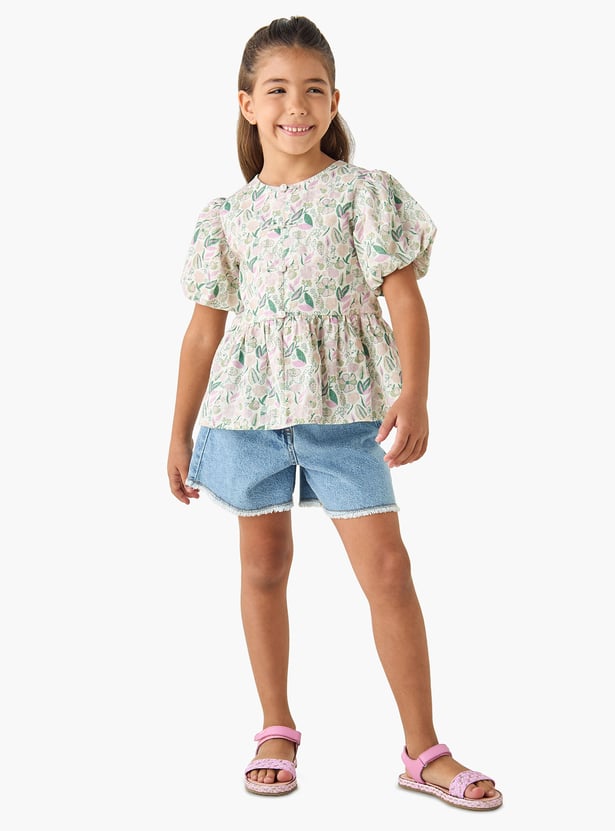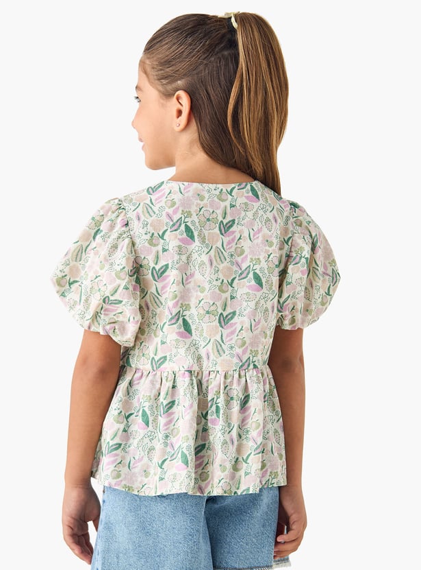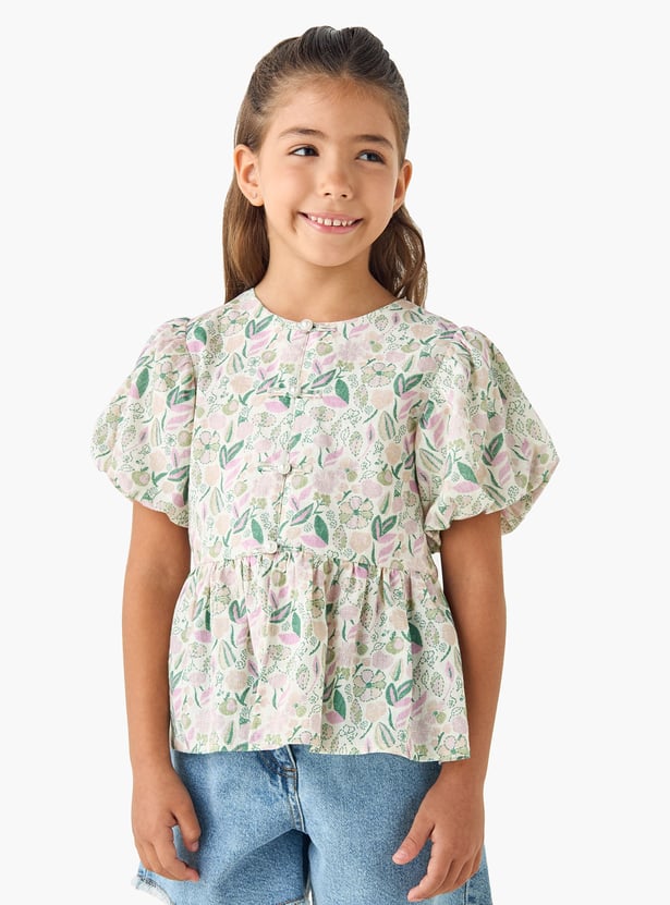 This peplum top with short puff sleeves features a charming all-over floral print, perfect for adding a touch of elegance to her wardrobe. The lightweight material and comfortable fit make it ideal for everyday wear. This top offers a stylish peplum design, creating a flattering silhouette.