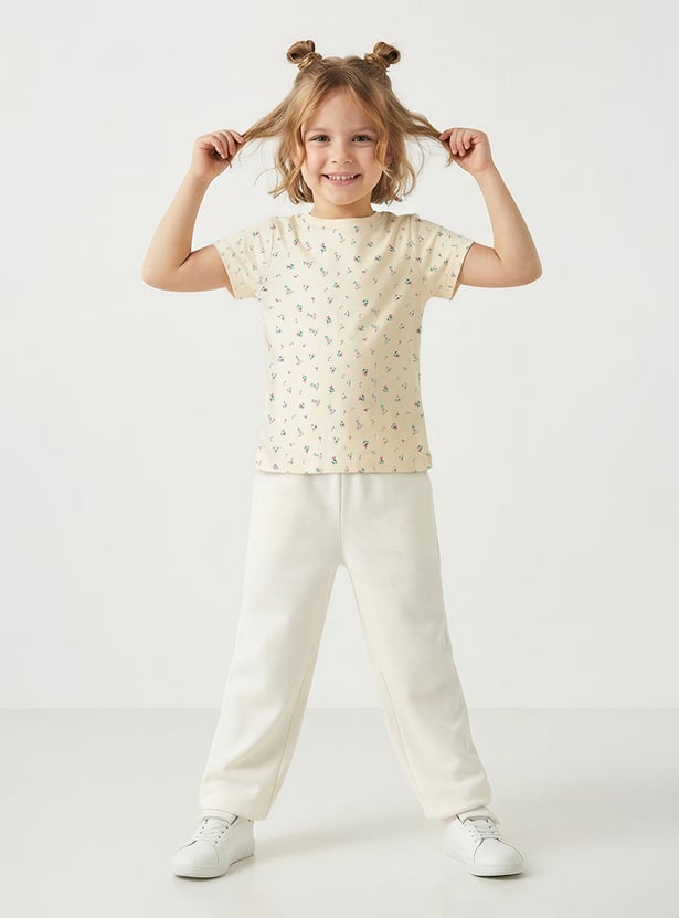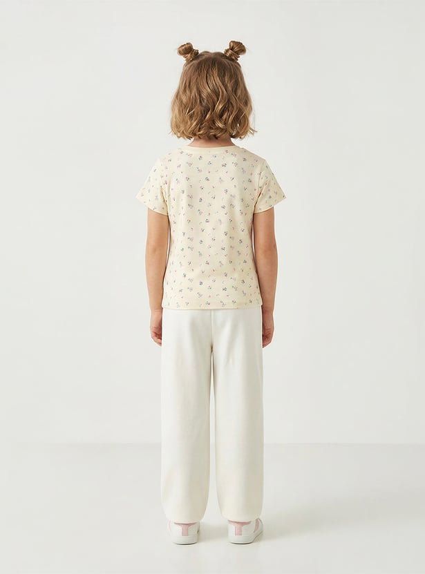 This t-shirt combines playful charm with everyday comfort. Featuring a vibrant all over floral print, this t-shirt adds a fun touch to your daughter's wardrobe. Designed with short sleeves and a classic round neck, it offers a relaxed feel that ensures all-day comfort. Made from soft, breathable fabric, this t-shirt is perfect for casual outings. Ideal for young girls, this t-shirt is a delightful addition to their casual wear collection.