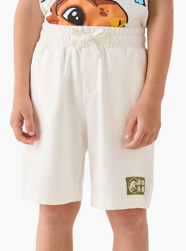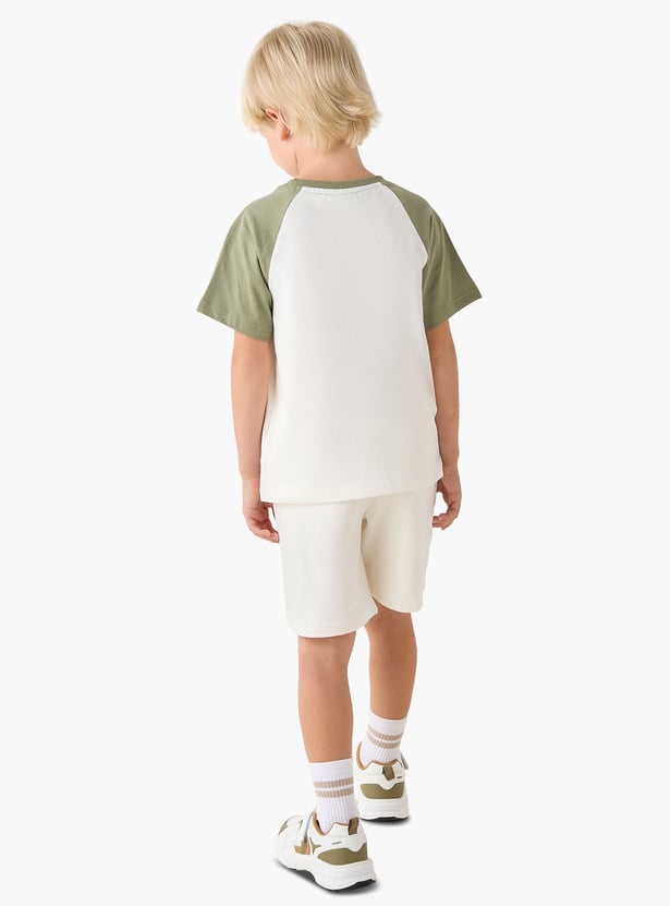Unleash your little one's adventurous spirit with this charming two-piece set, perfect for everyday wear. The comfortable T-shirt features a playful T-Rex graphic and contrasting raglan sleeves, ensuring a relaxed fit. Paired with coordinating elasticated shorts, this set offers both style and ease of movement for active boys.