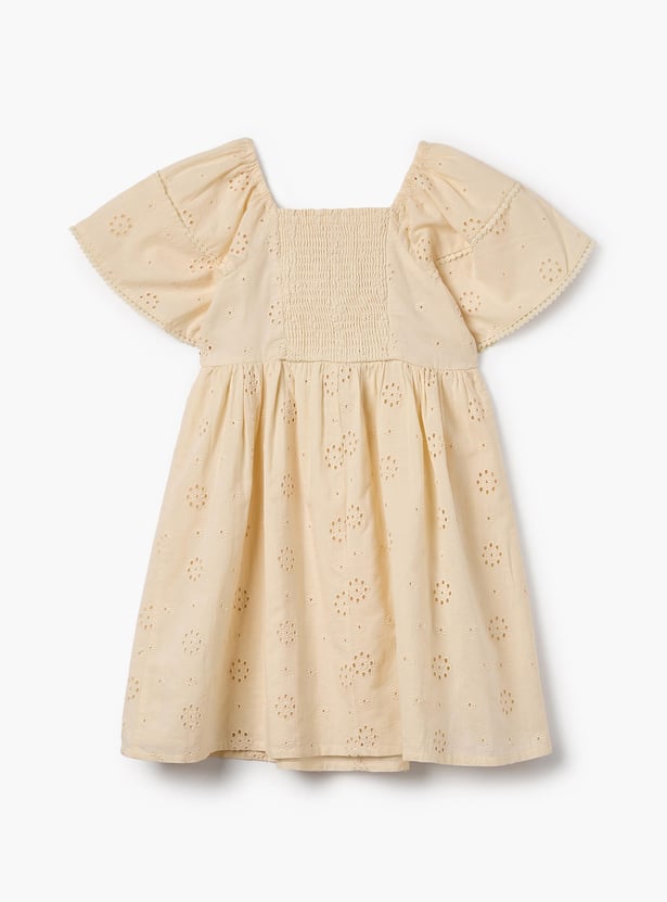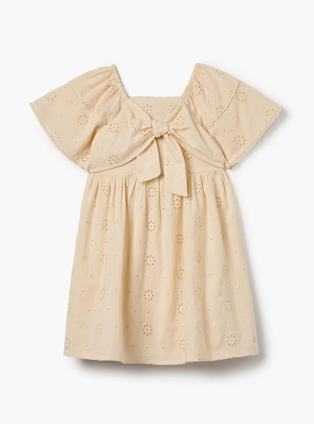 Juniors Schiffli A-line Dress with Bow Detail and Short Sleeves
