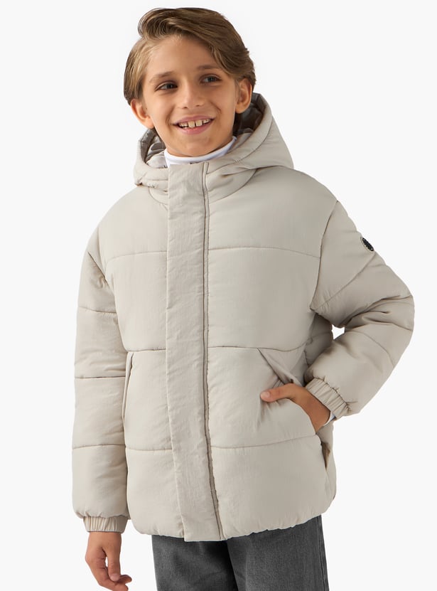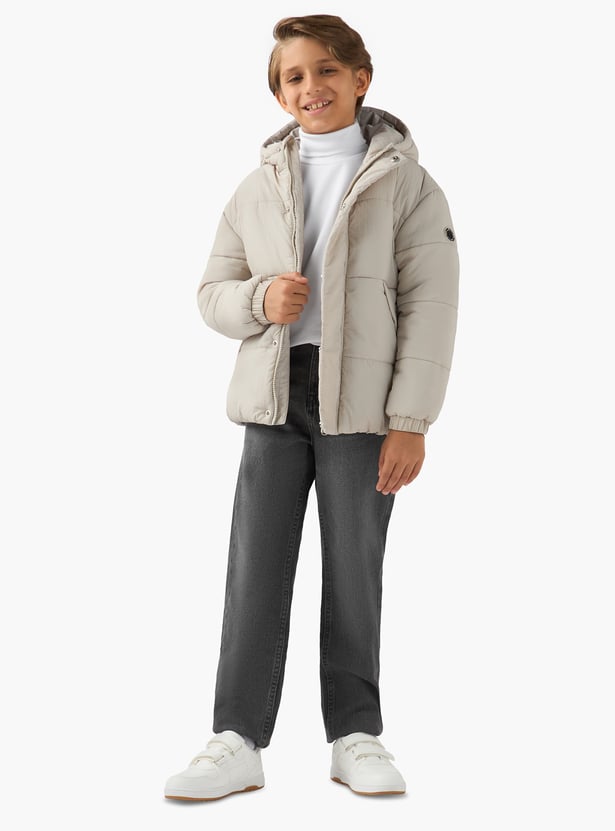 This warm, heavy jacket is a winter wardrobe essential for boys, offering both comfort and style. The attached hood and puffer design provide excellent insulation against the cold. This jacket allows your child to enjoy outdoor adventures whilst staying warm.