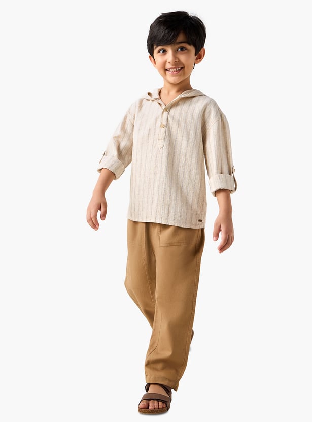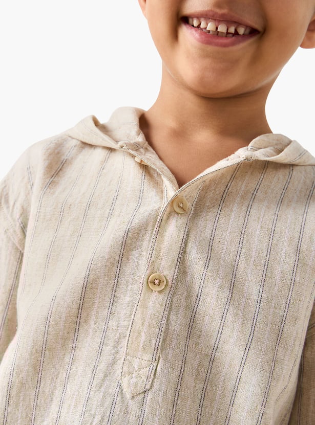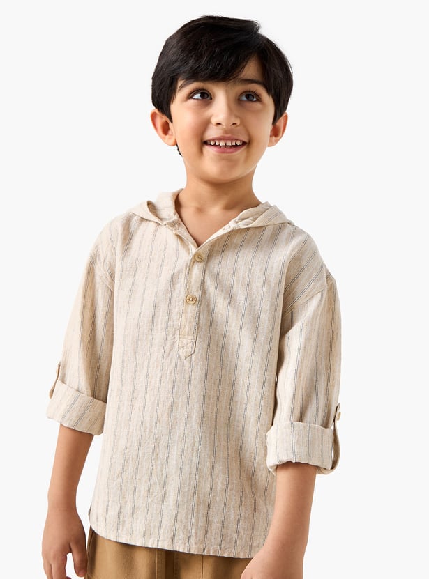 The t-shirt is a stylish and functional piece designed for comfort and versatility. Featuring classic stripes, this tee offers a trendy yet casual look, perfect for everyday wear. The attached hood adds a sporty touch, while the long sleeves with roll-up tabs allow for adjustable styling, making it ideal for changing weather conditions. Crafted from soft and breathable fabric, it ensures all-day ease for active kids.
