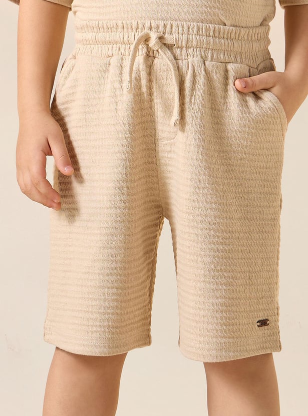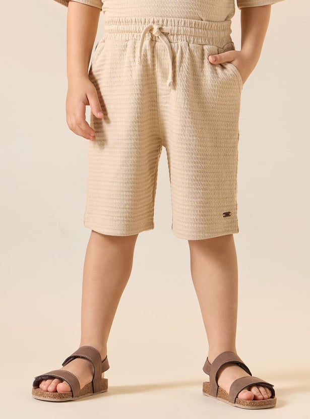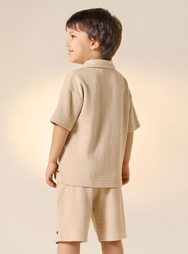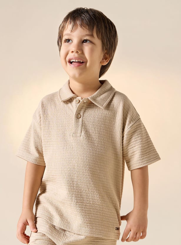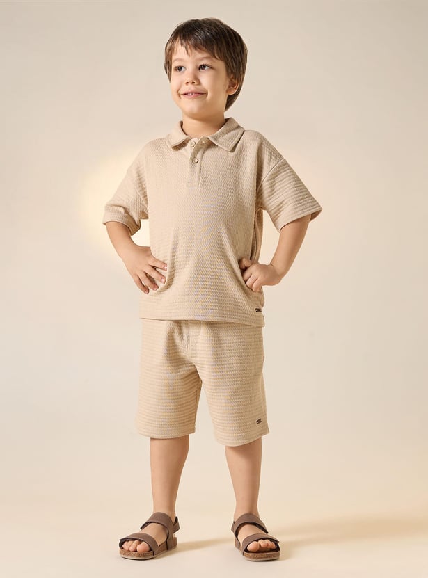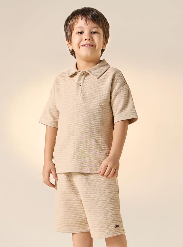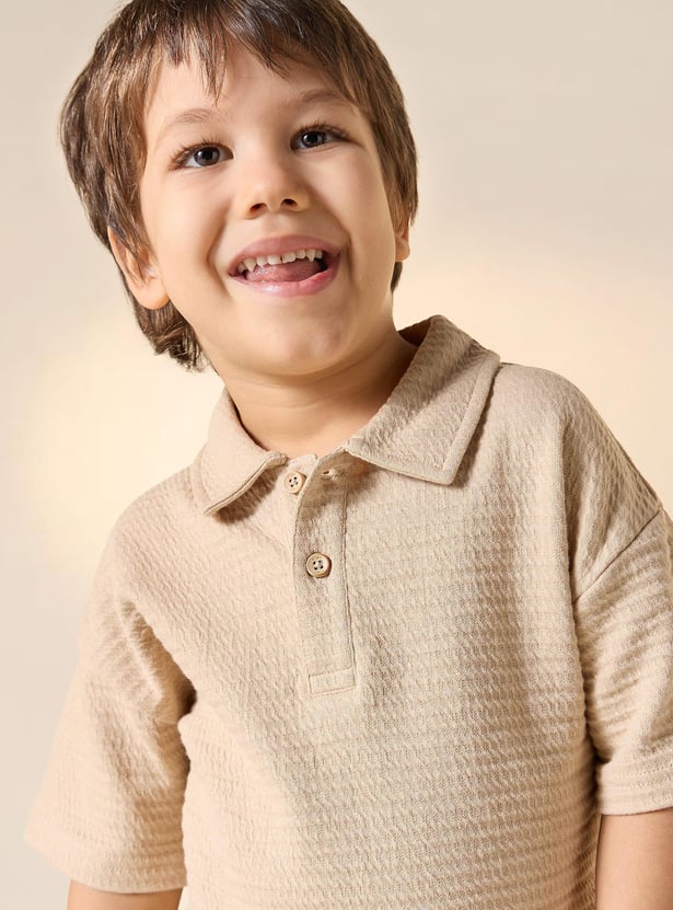 This two-piece set is perfect for your little boy. It includes a polo-neck t-shirt and a pair of shorts, both made from soft and breathable fabric. The set is available in a range of solid colours and features a classic textured design that is perfect for any occasion.